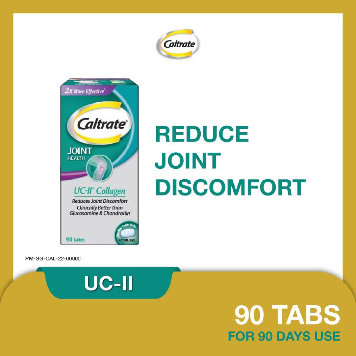Caltrate Joint Health UC-II Collagen Supplement Tablet (2X More Effective vs Glucosamine + Reduce Joint Discomfort) 90s Support your joint health with the Caltrate Joint Health Undenatured Collagen Type II (UC-II). Caltrate Joint Health UC-II contains UC-II undenatured collagen type II, a patented ingredient that has been clinically tested to reduce joint discomfort and promote healthy cartilage and joint flexibility for healthier and longer active living. MAHS2000216 **Where applicable, items have a minimum of nine-month shelf life before expiry unless otherwise stated on product description.