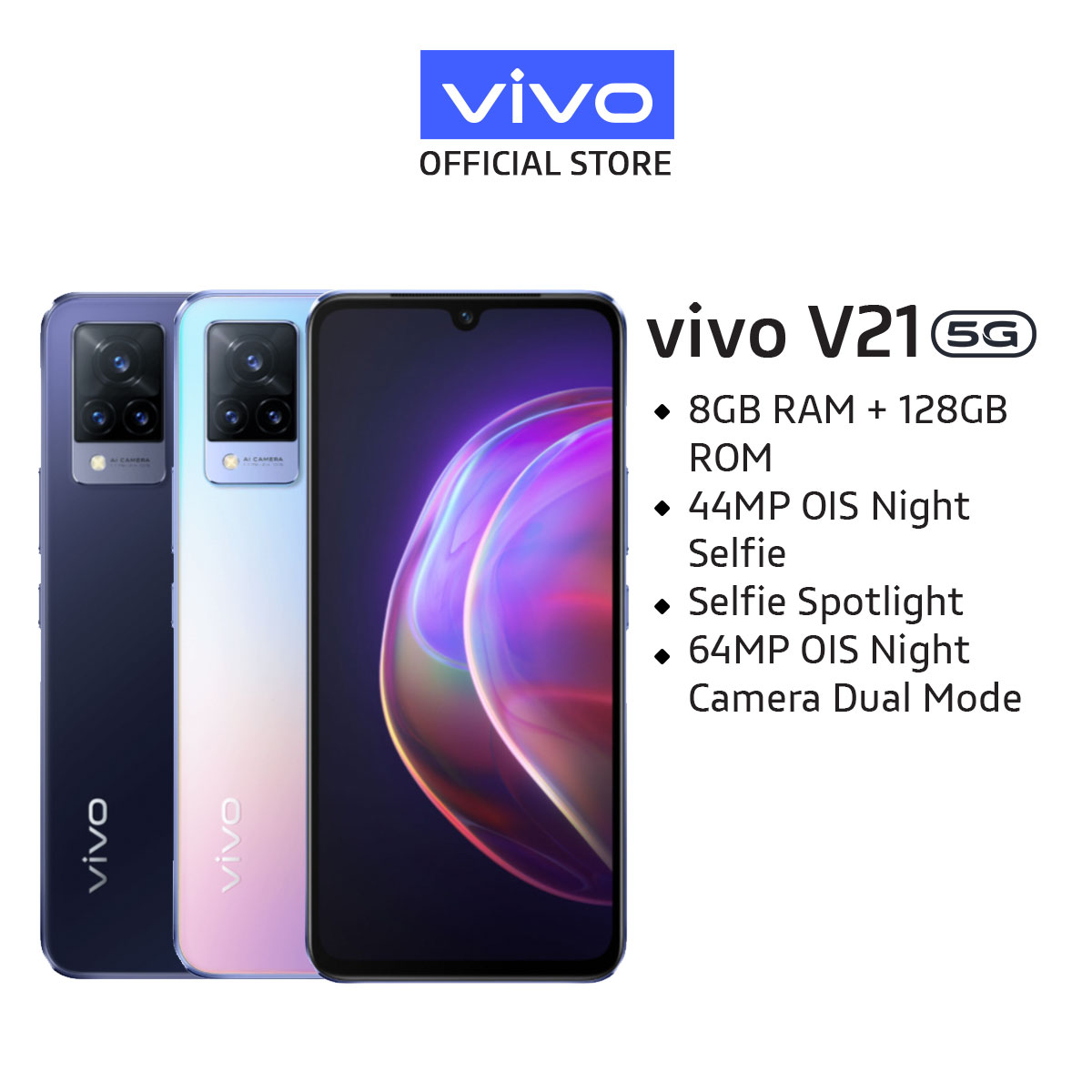 vivo V21 5G [8GB+3GB/128GB] 90hz Refresh Rate/44MP OIS Night Selfie/ 64MP OIS Night Triple Camera/ Dual Mode 5G【2 YEARS WARRANTY】