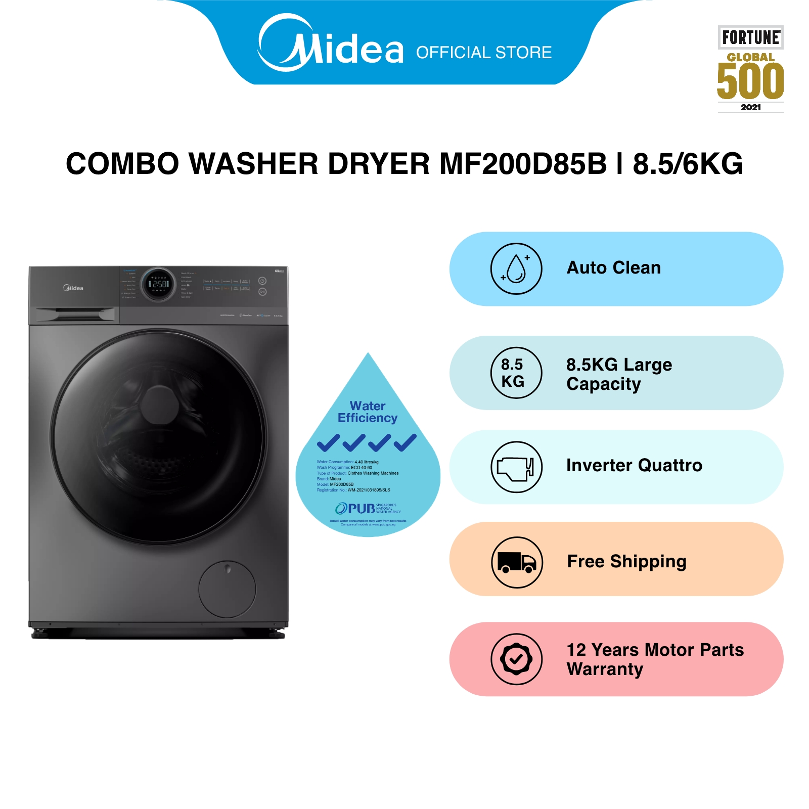[Bulky] Midea MF200D85B Dark Grey Washer-Dryer Combo, 8.5kg, Water Efficiency 4 Ticks