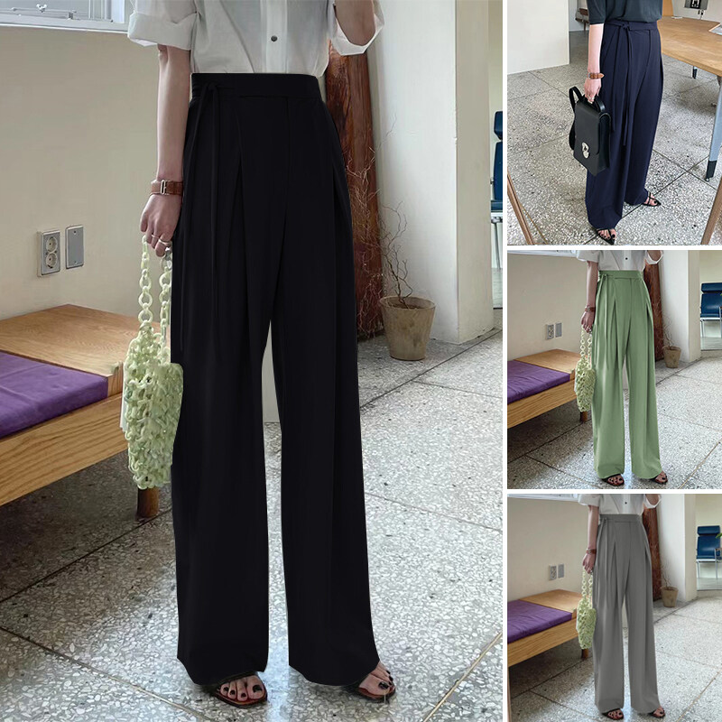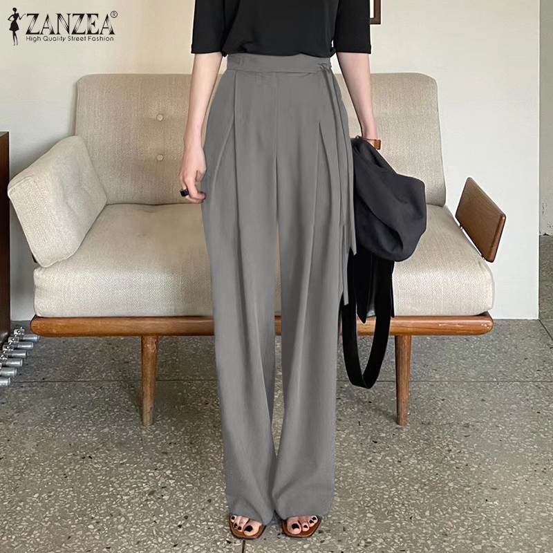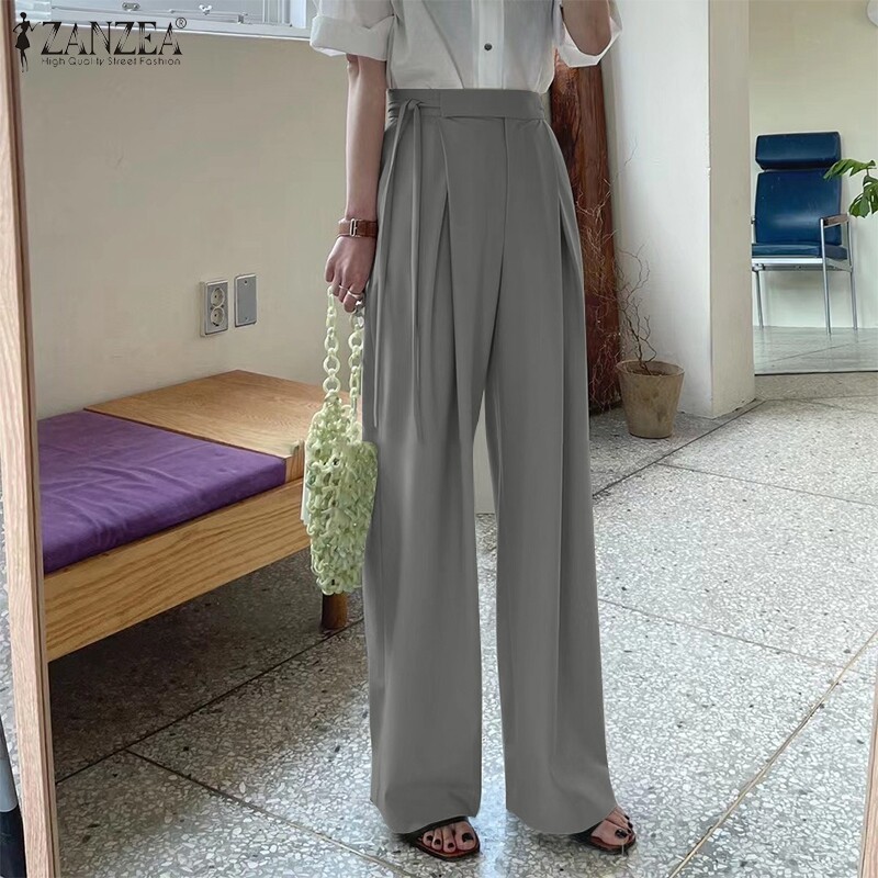 ZANZEA Korean Style Womens Button Lace-up High Waist Chic Trousers Wide Leg Pants Slacks