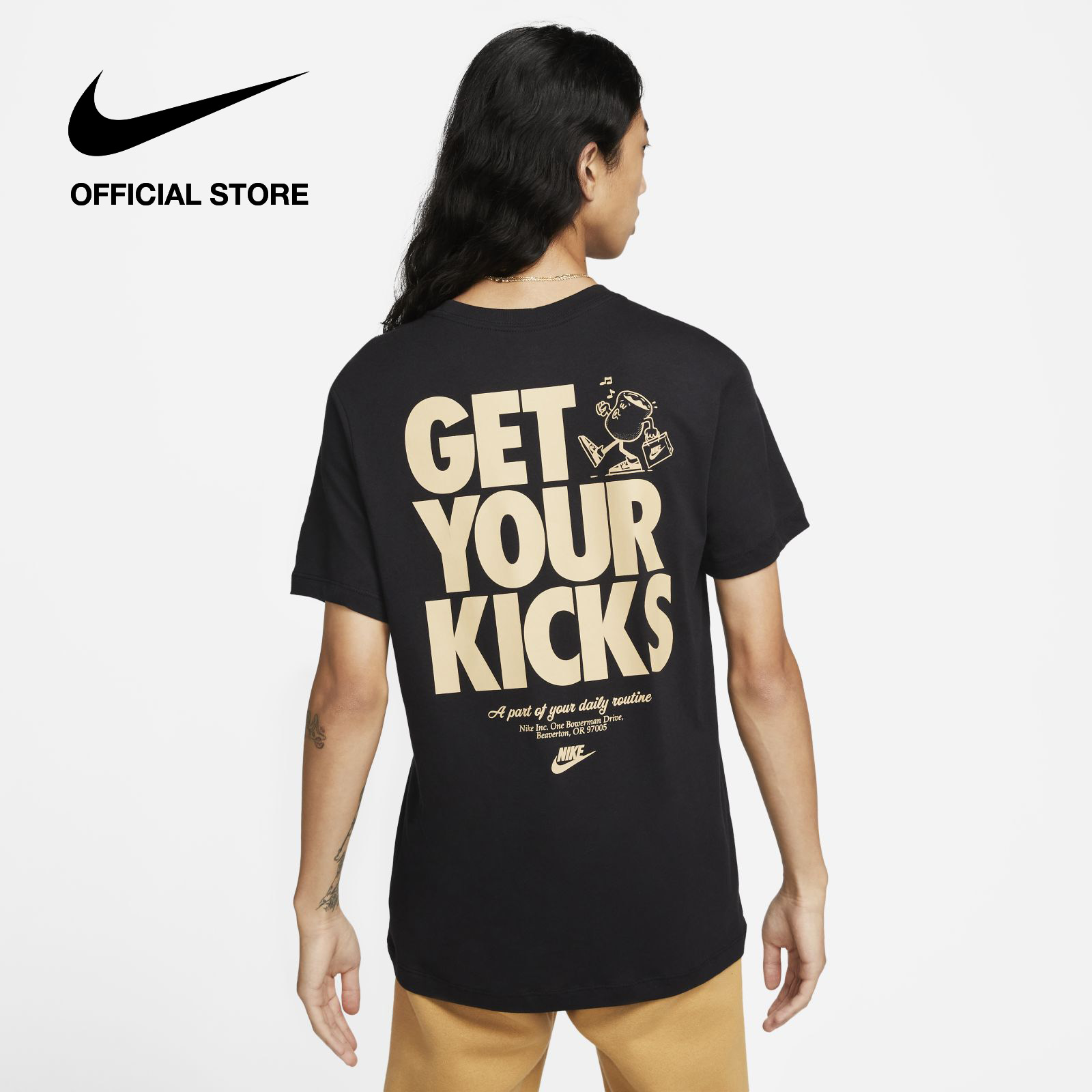 Rise and grind with the Swoosh and keep your style as fresh as your coffee beans. Made with our soft, lightweight cotton in a relaxed fit, this tee keeps it casual and comfy all day. Printed cafe-inspired graphics get you going in the morning.