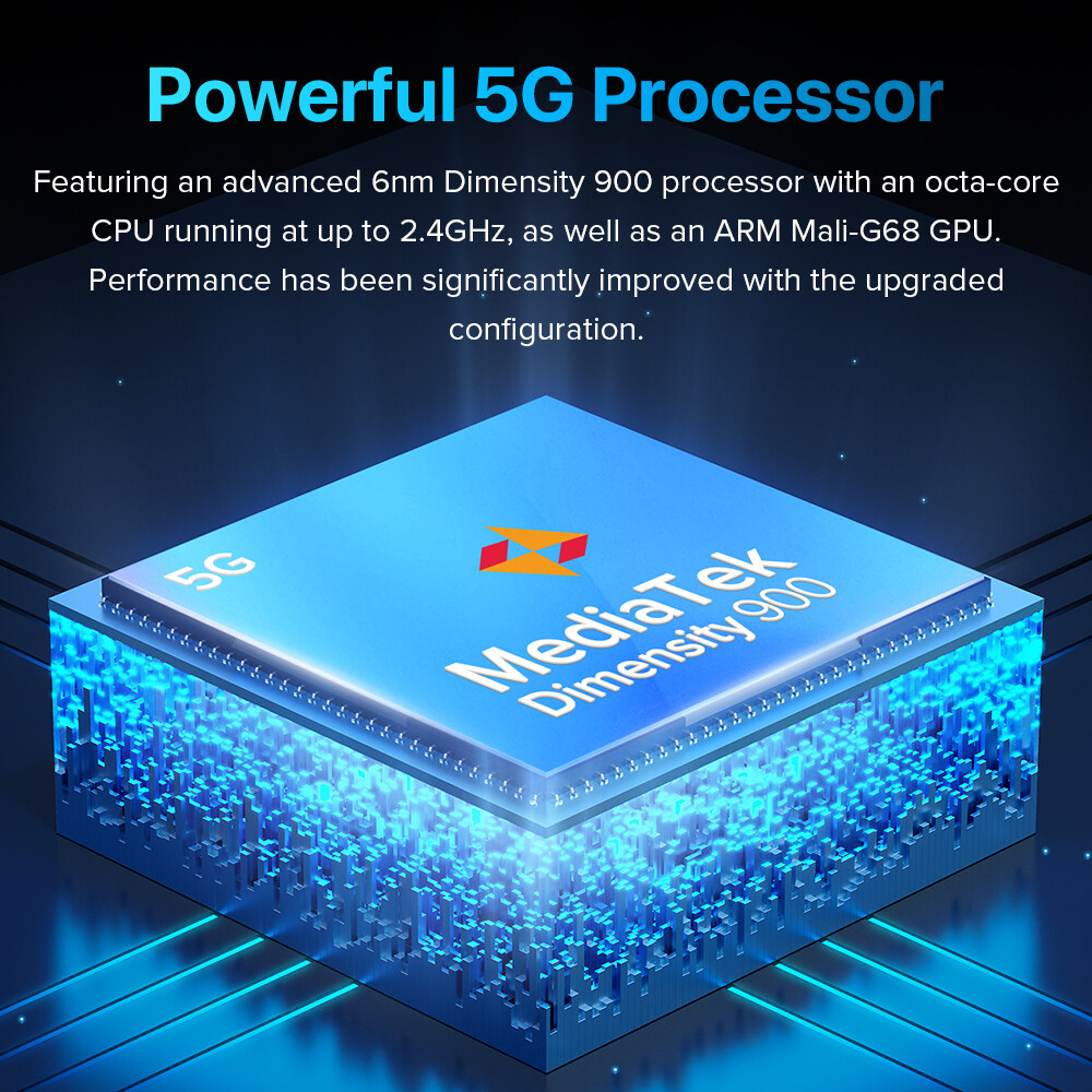 CPU:Dimensity 900, Octa-Core, 2 x ARM Cortex-A78, up to 2.4 GHz + 6 x Cortex-A55, up to 2.0 GHz
